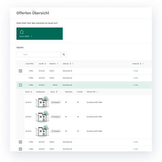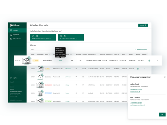 Ein integriertes Dashboard gibt jederzeit Überblick über laufende Offerten und Entwürfe und erlaubt eine direkte Weiterbearbeitung. Zusätzlich können Vaillant-Mitarbeitende ihre Partner dank «Guided Selling» im Erstellungsprozess unterstützen oder selbst Offerten erfassen.