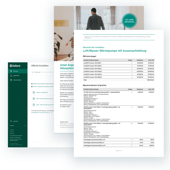 Im Zentrum der Lösung steht ein intuitiver, geführter Prozess zur Erstellung professioneller Offerten – abgestimmt auf die Arbeitsweise der Vaillant-Partner. Die wichtigsten Funktionen im Überblick: