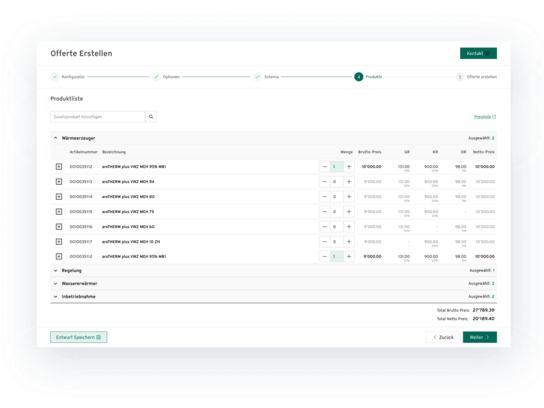 Der Prozess startet mit einem Konfigurator, in dem zentrale Parameter des neuen Heizsystems definiert werden. Auf dieser Basis schlägt das System passende Produkte vor. Nach Auswahl des geeigneten Systems wird automatisch eine Produktliste inklusive Mengen, Preisen und Rabatten erstellt. Diese lässt sich flexibel anpassen, bevor die finale Offerte generiert wird.