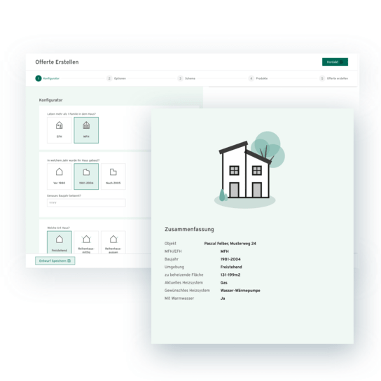 Der Einstieg in die Offerterstellung erfolgt über einen interaktiven Konfigurator. Hier erfassen die Partner zentrale Parameter wie Art und Grösse der Liegenschaft, Informationen zum bestehenden Heizsystem sowie Anforderungen an das neue System. Mit dem Konfigurator lassen sich die für die Offerte relevanten Daten rasch und zentral erfassen, und auch solche dokumentieren, die der Installateur im späteren Verlauf benötigt. Alle Daten werden über beide Schritte hinweg übersichtlich dargestellt – für maximale Transparenz.